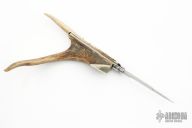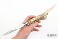 This Swivel Bolster from Stiletto Italy features a tumble finished bayonet ground blade with false top edge. The handle is comprised of stainless steel bolsters with stag scales over brass liners and stainless steel backspacer. Has some light scratches, one of the pins is loose on one side of the scale handles, otherwise good condition.
