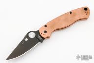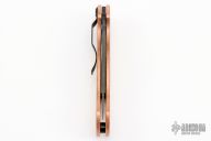 This Paramilitary 2 Linerlock Folder has a black clip point REX45 blade with thumb hole and notched thumb rest. Handle is tumbled copper with stainless steel liners and stainless steel 4-way reversible clip. Excellent condition. Comes with original box and papers. Blade HQ Exclusive
