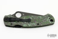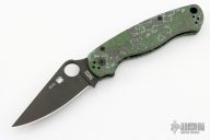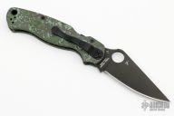 This Paramilitary 2 Linerlock Folder from Spyderco has a black finished clip point blade with thumb hole and notched thumb rest. Handle has black/green Fat Carbon scales with stainless steel liners and stainless steel 4-way reversible clip. Comes with original box and papers. Excellent condition.