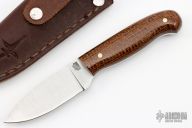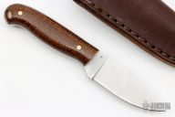 This knife by LT Wright features a satin finished blade with .113" blade stock and .837" blade depth, full tang construction. The handle has burlap micarta scales with brass pins. Comes with a brown leather sheath and original box. Excellent condition.