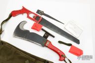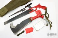 Vietnam Era US Airman's Survival Tool Kit Type 1. Comes with the Woodman's Pal by Victor Tool Co in Oley, PA. Hawkbillblade with hook on the spine, .122" blade stock and 5.25" blade depth, full tang construction with a red wooden handle. Has been used, has scratches, dings and patina, otherwise good condition for its age. Nothing a little sharpening won't fix. This knife is contained in the canvas sheath with zippers. In the same zipper pouch as the knife is a Safety Sharpening Stone by Victor Tool Co and its original pouch and papers. Also comes with original instruction booklet for the kit. On the sheath is a secondary zippered pouch. Inside that pouch is a Global Survival-Saw by Victor Tool Co. with a wood cutting and a metal cutting blade. This set is old, but in very good condition for its age, even though it has some oxidation and such, it has all the parts and the sheath is in great shape.