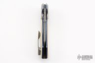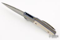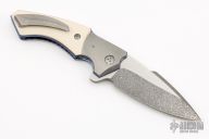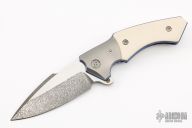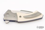 This White Swan Linerlock Flipper from Allen Elishewitz features a black snow finished drop point blade with swedge and flipper. The handle is comprised of bead blasted and dovetailed titanium bolsters, ivory paper micarta scales, textured and anodized titanium liners, red/green G-10 backspacer, bead blasted titanium tip up pocket clip with hidden screws. Excellent condition.