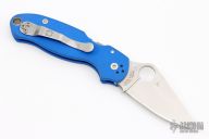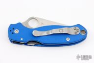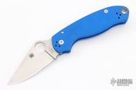 This Para 3 by Spyderco features a satin finished clip point blade with thumb hole and notched thumbrest. The handle has blue G-10 scales over nested steel liners and stand-offs. The steel pocket clip is 4 way adjustable. Includes original box and papers. Has a couple of light scuffs, otherwise excellent condition. Bento Box Exclusive.