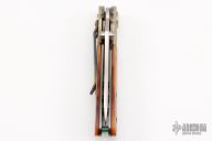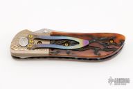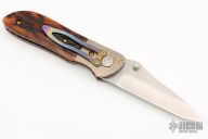 This early folder by Allen Elishewitz has a tumble finish blade with dual thumbstuds. The handle has mokume bolsters, jigged bone scales, anodized titanium liners and tip down clip. Nice lockup, detent, and seating. Has a couple light scratches, otherwise excellent condition.