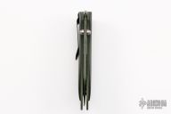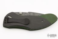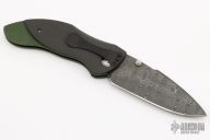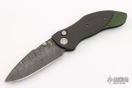 This button lock folder by Allen Elishewitz features a Damascus blade with dual thumbstuds. The handle has black G-10 scales, anodized titanium liners, black stainless steel clip, tip down carry. 9 titanium barrel spacers. Has a couple light scuffs, otherwise excellent condition.