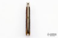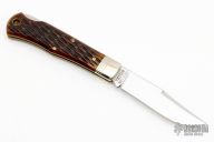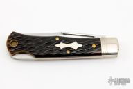 Handle: Built with traditional brass liner and pin construction, the compact handle sports "Dark Brewed" jigged bone covers, polished and grooved nickel silver bolsters and matching Orleans shield. The handle offers a solid grip and has a hollow brass pin for lanyard attachment. The full length back spring protects the blade when closed and forms the lock back mechanism for safe, secure use.
