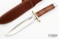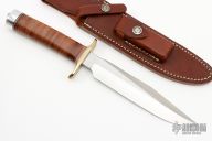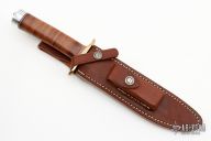 This Model 1-7 from Randall Made Knives features a satin finished clip point blade with sharpened top edge, .198" blade stock and 1.248" blade depth, hidden tang construction. The handle is comprised of a brass guard, red/white/blue spacers, stacked leather handle and duralumin pommel. Comes with brown leather sheath. Excellent condition.