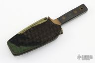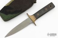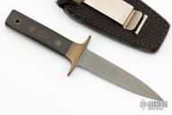 This Vintage Fang boot dagger by Al Mar Knives features a double edged bead blast finished blade, .127" blade stock and .733" blade depth, full tang construction. The handle has brass bolsters, pins and lanyard tube, and black/brown paper micarta scales. Has some patina on the brass and a few light scuffs, otherwise good condition for its age. Comes with a camo leather sheath with boot clip and original box.
