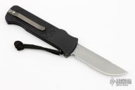 This OTF automatic by Rob Dalton features a bronzed and bead blast blade and black milled aluminum handle. Titanium clip. Fires via push button and retracts by holding the button and moving the slider on the side of the knife. F00455. Has a couple light scuffs and scratches, excellent condition otherwise.