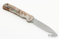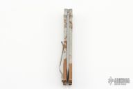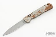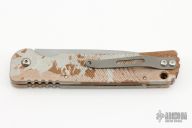 This Militia by Rob Dalton features a bead blasted drop point blade with swedge. The handle is comprised of a splash camo aluminum frame with bead blasted stainless steel pocket clip position for tip up carry, left or right reversible. Lanyard hole in pommel. S/N 0021. Has a couple light scuffs, Excellent condition.