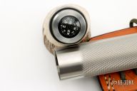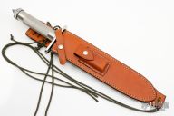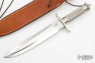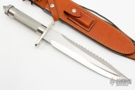 This Survival Bowie knife by Colin Cox features a satin finished blade with functional saw teeth on the top edge, nickel silver hilt, and a knurled stainless steel handle. 1/4" blade thickness and 2" blade depth. Handle is drilled out to make a hollow waterproof survival compartment. Compass embedded in butt cap. Includes a Byrds Leather Randall Model C" style sheath with sharpening stone. Very nice work. Has some light scratches, excellent condition. Comes with a zippered case.
