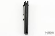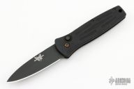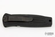 This 3550 Mel Pardue designed side opening auto from Benchmade has a black spear point blade with a false top edge. Handle is matte black finished aluminum with milled contours, spine-thumb safety button, black stainless steel tip down clip, and lanyard hole. Has a few light scuffs and scratches, otherwise excellent condition.