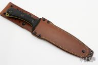The 3V Syndicate Jungle Combat is a modern rendition of the Vietnam style Bowie knife, measuring 12" in overall length. The drop point fixed blade is made from .195" thick CPM-3V and features a 7” blade. Like all RMJ knives, tomahawks and tools, the Jungle Combat can handle very heavy use and punishment while still maintaining its edge. The blade has a full flat grind and includes an added fuller design for a very aggressive look.