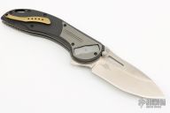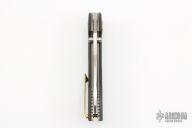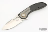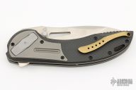 Designed by knife innovator Flavio Ikoma the XOC might be considered overkill but Ikoma thinks that bigger is better and in this case he might be right. This limited edition folder is the first design in the world to house the Deadbolt locking mechanism. This massive flipper comes with titanium inlaid carbon fiber handles and high performance CTS-XHP Stainless Steel blade. Blade: The XOC exhibits the curves and lines Flavio Ikoma is known for with a large, sweeping recurve blade of CTS-XHP for high-end performance. The blade deploys fast and smooth via an index flipper or can be opened utilizing the thumb stud pins or "shackle key" blade cutout. A beautiful satin finish adds to the custom feel of this limited production piece. Handle: The clean lines of the carbon fiber handles are elegant and ergonomic in the hand. A titanium inlay near the blade houses the Deadbolt locking mechanism that is as simple as pushing a button to operate while delivering robust strength. Steel pegs interlock with the blade when it is deployed to yield strength that gives uncompromising reliability even under serious weight. A brass colored pivot collar adds another custom detail contrasting with the grey titanium. The "shackle key" hole at the pommel end allows for easy lanyard attachment. Carries via a right hand, tip-up, stainless steel carry clip. Comes with original box and leather case. Excellent condition.