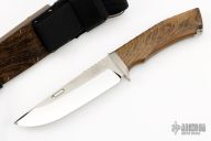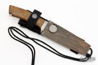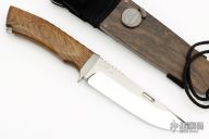 This KON by Rockstead features a mirror polished blade with a false top edge and notched thumbrest, .204" blade stock and 1.315" blade depth, hidden/mortise tang construction. The handle has stainless steel guard and lanyard hole, wood micarta grip. Comes with a wood and black nylon sheath with lock on the front. Comes with original silk bag and papers. Excellent condition. CRAZY SHARP! Blade Steel: ZDP189 clad by VG10