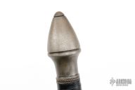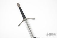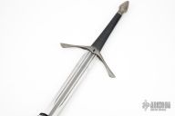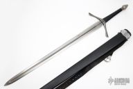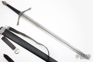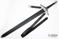 This Claymore by Rick Barrett features a hand rub satin finished double edged blade with fullers, .218" blade stock and 2.075" blade depth, hidden tang construction. The handle has a textured steel double guard and butt, leather wrapped grip with fileworked spacers. Comes with a black leather scabbard with back carry rig. Has a very small ding on one of the guard quillions, otherwise excellent condition. Stunning piece!