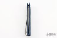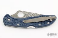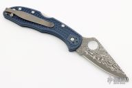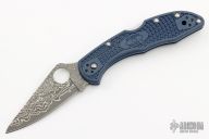 This knife by Spyderco has a Damascus VG-10 Core blade with thumbhole opener and notched thumbrest. The handle has blue FRN scales and a 4-way reversible MXG Deep Carry clip. Comes with original box and papers. Excellent condition.