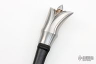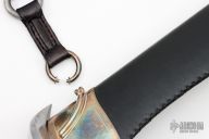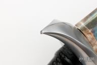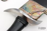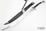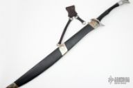 This Scimitar by Raven Armoury features a hand rub satin finished blade with false top edge, .265" blade stock and 1.965" blade depth, hidden tang construction. The handle has a stainless steel guard, leather covered grip, and a stainless steel butt with sterling silver embellishment. Comes with a black leather and .999 silver scabbard. Has a dent on one of the guard quillions, otherwise excellent condition.