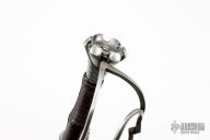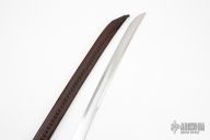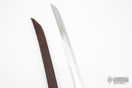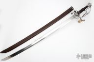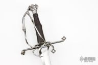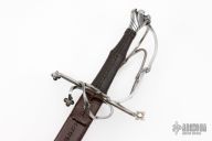 The Swiss Sabre II, by JT Palikko, is a two-hand sabre from the renaissance period, modeled after two historical swords. This one has a hand rub satin finished blade with sharpened top edge, .239" blade stock and 1.450" blade depth, hidden tang construction. The handle has a steel hand guard and spiral fluted butt, leather wrapped grip. Has some oxidation on the guard and butt, otherwise excellent condition. Comes with a matching brown leather scabbard.