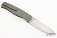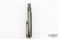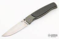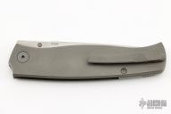 This Strizh by Alexander Cheberkov features a stonewashed blade with notched thumbrest and a single thumbstud. The handle has a stonewashed titanium frame with blasted hardware and inlaid liner, matching backspacer and tip up clip with hidden screws. Carbon fiber overlay. Comes with original box and papers.  Excellent condition.