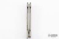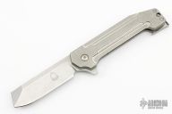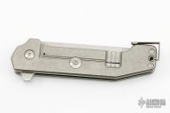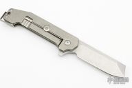 This GMT Razel GT Mid-Tech by Jon Graham features a stonewashed blade with flipper. The handle has a stonewashed titanium frame with matching tip up tail clip, satin finished lockbar stabilizer. Comes with a cloth pouch. Excellent condition. Rides on bearings, nice detent, lockup and blade seating.