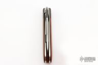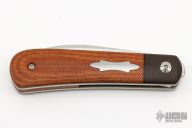 This Swayback Front Flipper by Enrique Pena features a hand rub satin finished wharncliffe blade with swedge, notched thumbrest and front flipper. The handle has brown canvas micarta bolsters, natural canvas micarta scales with black G-10 liners, titanium liners, natural canvas micarta backspacer. Includes padded and zippered case. Excellent condition.