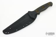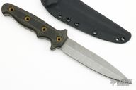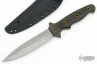 This Vorpal by Ben Tendick features a tumbled spear point blade with false top edge, .212" blade stock and 1.204" blade depth, full tang construction. The handle has black canvas micarta scales with tube pins. Comes with a kydex sheath. Excellent condition.