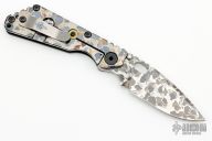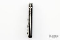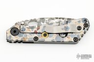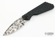 This SNG framelock folder by Mick Strider is a collaboration with Prometheus Design Werx, it features a drop point blade with frog skin pattern, notched thumbrest and a thumbhole. The handle has a frog skin pattern black aluminum and titanium frame with matching tip up titanium clip. Includes Hinderer "Lock Bar Stabilizer" for maximum reverse lock retention. Nice detent, lockup and blade seating. Excellent condition.