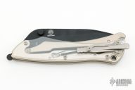 This Griplock Folder by Boker features a black blade with dual thumbstuds, notched thumbrest and flipper. The handle has clear plastic scales and a silver aluminum frame, has a tip up stainless steel clip. Comes with zipper case. Excellent condition.