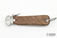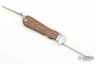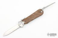 This Gravity Knife features a satin finished blade. The handle has a stainless guard, wood scales, steel liners and backspacer, marlin spike on the spine. Has a couple light scratches otherwise excellent condition.