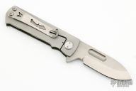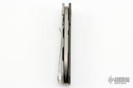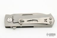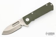 This TFF-4 by Medford Knife and Tool features a matte finished spear point blade with fullers and flipper. The handle is comprised of a green coated aluminum and bead blasted titanium frame with satin tip up clip over a steel backspacer/glass breaker. Comes with original hard case and papers. Has a couple light scratches, otherwise excellent condition.
