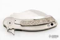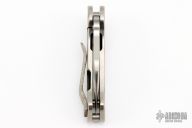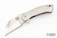 This TMA #25 by Grindhouse Knives features a hand rub satin finished wharncliffe blade with notched thumbrest and flipper. The handle has a hand rub satin finished titanium frame with a crystal titanium tip up clip, lanyard hole at the butt. Comes with a cloth pouch and COA. Nice detent, lockup and blade seating. New from maker.