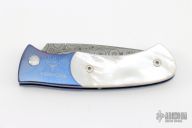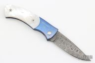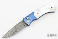This TAD Gear Custom Duke by Pro-tech features a Damascus drop point blade. The handle has an orange peel finished and anodized titanium frame with mother of pearl inlays. Comes with a zippered case. Has a couple light scuffs, otherwise excellent condition.