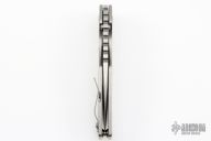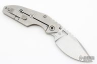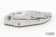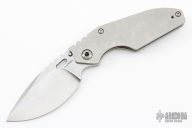This XL Jibble by Mick Strider features a stonewashed blade with notched thumbrest and a thumbhole. The handle has a stonewashed titanium frame with tip up reversible clip. Nice detent, lockup and blade seating. New Condition.