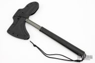 What sets the S13 apart from other tools is the rubber over-molded handle. The advantage of such a design is not only a great grip but vibration reduction and that fact that the handle is insulated. The S13 Shrike has been tested to provide insulation up to 2,000 volts. If the tool is being used to chop through a wall and happens to connect with a live electrical wire, a good degree of protection exists from getting electrocuted. The butt end of the grip features a cap that screws off to gain access to a small storage compartment. We do sell a sharpening file that fits the butt-cap, HERE The ax features a Tungsten Cerakote finish for corrosion and wear resistance and a low visibility look. Included is a molded, bottom-eject kydex sheath and low-ride M.O.C. straps.