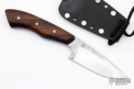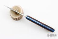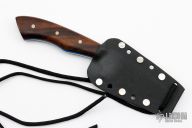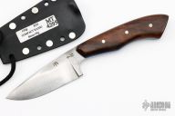 This Muteki neck knife by Murray Carter Apprentice Cory Pulliam features a hitachi white #1 steel core laminated with 410 stainless steel drop point blade with a full tapered tang construction, .121" blade stock, 1.117" blade depth.  The handle features desert ironwood scales over blue G-10 liners.  Includes a kydex neck sheath.  Excellent Condition.