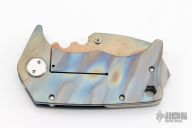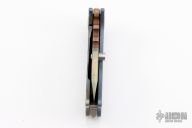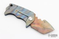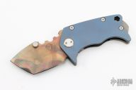 This Panzer by Medford Knife and Tool features a Vulcan finished tanto style blade with a single thumbstud and a notched thumbrest.  The handle features an anodized titanium frame with a D2 backspacer.  Includes a Medford box and papers.  The box is not original and is mislabeled.  Excellent condition.