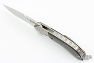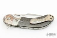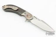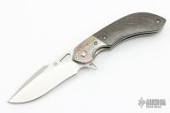 This custom Mike Vagnino designed Compact Wayfarer flipper features a satin finished blade with notched thumbrest and flipper. The handle has mokume bolsters, copper dust carbon fiber scales, tip up mokume clip, titanium backspacer, satin finished titanium liners with jeweled interiors. Great action that requires no wrist movement. Nice detent, lockup and blade seating. Comes with zippered/padded case. Excellent condition.
