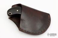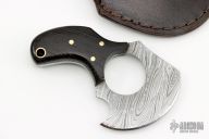 This Knife by SMID Damascus features a Damascus blade with .121" blade stock and 2.396" blade depth, full tang construction. The handle has black wood scales. Comes with a brown leather sheath. New from maker.