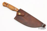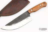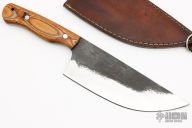 This Chef's Chopper by MA Knives features a mirror finished blade with forge finished flats, .098" blade stock and 2.525" blade depth, full tang construction. The handle has laminated wood scales with aluminum pins. Comes with a brown leather sheath. New from maker.