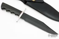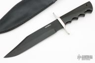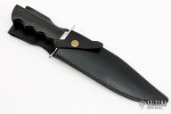This Model 14CDT style fighter by MA Knives features a black coated blade with false top edge, .195" blade stock and 1.482" blade depth, hidden tang construction. The handle has a stainless steel guard and black canvas micarta finger grip style handle with red/black spacers. Comes with a black leather sheath. New from maker.