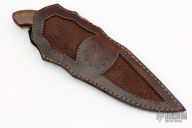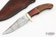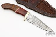 This Knife by SMID Damascus features a Damascus blade with a false top edge, .151" blade stock and 1.437" blade depth, hidden tang construction. The handle has a brass guard, dark wood and red wood grip with white spacers. Comes with a brown leather sheath. New from maker.