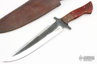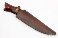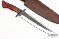 This Fighter by MA Knives features a mirror polished blade with forge finished flats, false top edge, .167" blade stock and 1.849" blade depth, full tang construction. The handle haswood bolsters and red wood scales, brass pins. Comes with a brown leather sheath. New from maker.