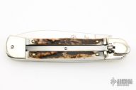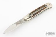 This leverlock auto by Hubertus features a mirror polished blade, nickel silver double bolsters, stag scales, and brass liners and pins. Opens with a nice snap. Very fast opening. Comes with original box and papers. Excellent condition.