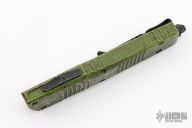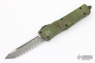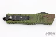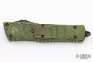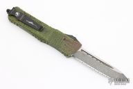 This Combat Troodon OTF automatic by Microtech features a distressed tanto blade with fullers and serrations. Outbreak coated Deep Engraved aluminum contoured frame with distressed hardware. Dated 09/2022 S/N 084. Comes with original box and papers. Excellent condition.
