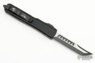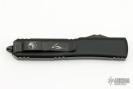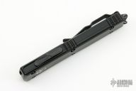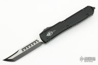 This Ultratech Hellhound by Microtech Knives features a two-tone black DLC blade with notched thumbrest and fullers, false top edge. The handle has a black aluminum frame with tip down black stainless steel clip, black DLC hardware, black titanium thumbslide. Comes with original box and papers. Excellent condition. Dated 11/2022 and s/n 937