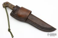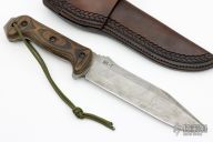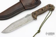 This BK-7 from Becker Knife & Tool features a clip point blade that has been refinished and giving a forced patina, .187" blade stock and 1.797" blade depth, full tang construction. The handle has custom canvas micarta scales. Comes with a custom hand tooled brown leather sheath. Has been resharpened well, excellent condition.