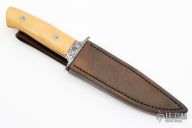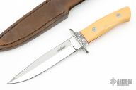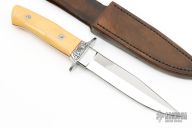 This Loveless Style Fighter by Edward Kalfayan features a mirror polished double edged blade, .197" blade stock and 1.153" blade depth, full tapered tang construction. The handle has an engraved 416 stainless steel guard, Westinghouse ivory paper micarta scales with red liners/spacers, engraved stainless steel pins. Engraved by Fred Harrington. Comes with a brown leather sheath and COA. Has some light scratches, otherwise excellent condition.