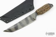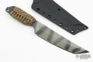 This LD Tanto by Strider Knives features a tiger striped blade with notched thumbrest, .252" blade stock and 1.300" blade depth, full tang construction. The handle has paracord wrap. Comes with a kydex sheath. Light sheathing marks, otherwise excellent condition.