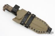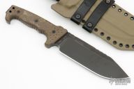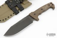 This Custom M-8 by Miller Bros Blades features a black clip point blade with notched thumbrest made from Z-Wear PM steel, .330" blade stock 2.292" blade depth, full tang construction. The handle has brown G-10 scales with notched tang top and bottom. lanyard holes at the butt. Comes with a kydex/leather sheath. Has a couple small nicks in the blade edge, has been resharpened, otherwise excellent condition.